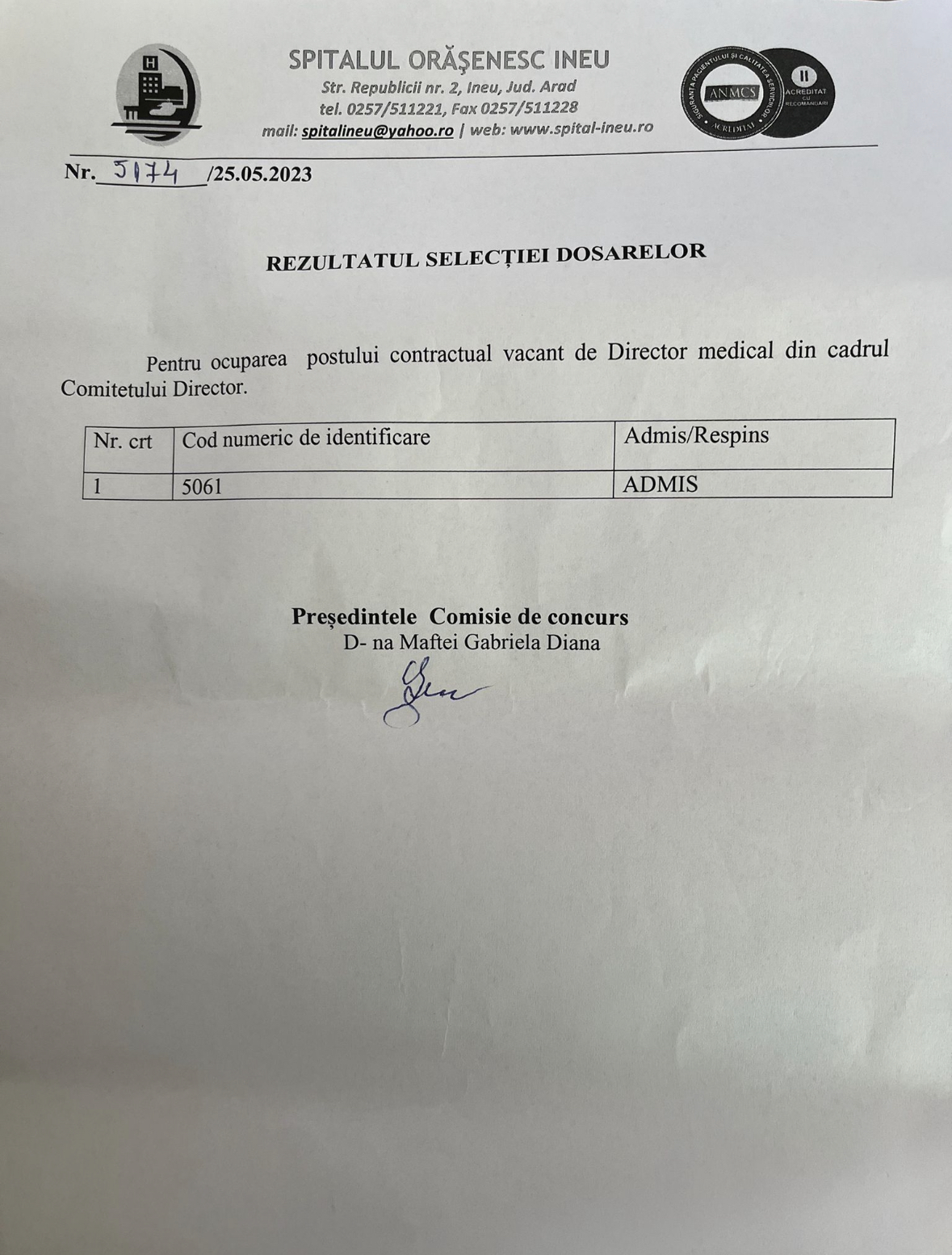 Concurs ocupare post vacant Scris de Spital Ineu on 28 Aprilie 2023. Posted in Anunțuri Concurs ocupare post director medical ANUNȚ CONCURS + CALENDAR - descarcă aici TEMATICĂ - descarcă aici [25.05.2023] Stare dosare - descarcă aici [31.05.2023] Rezultat final - descarcă aici